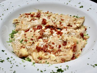 Ravioli filled with a blend of goat cheese, ricotta, prosciutto and fresh basil tossed with a marsala cream sauce, sprinkled with walnuts, parmigiano and crispy prosciutto.