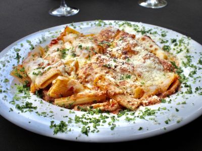 Sliced chicken breast and Italian sausage tossed rigatoni with ricotta and marinara,